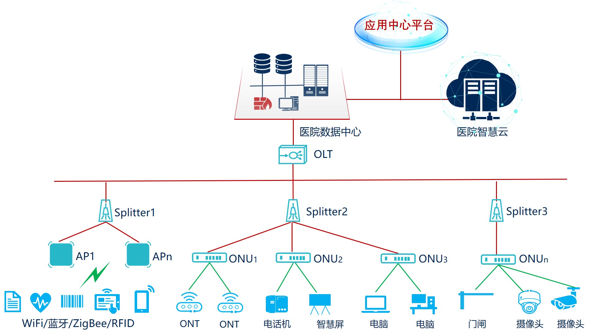 部署POL全光+无线+IOT融合通信的方案作为医院众多不同终端的连接和数据的传输。