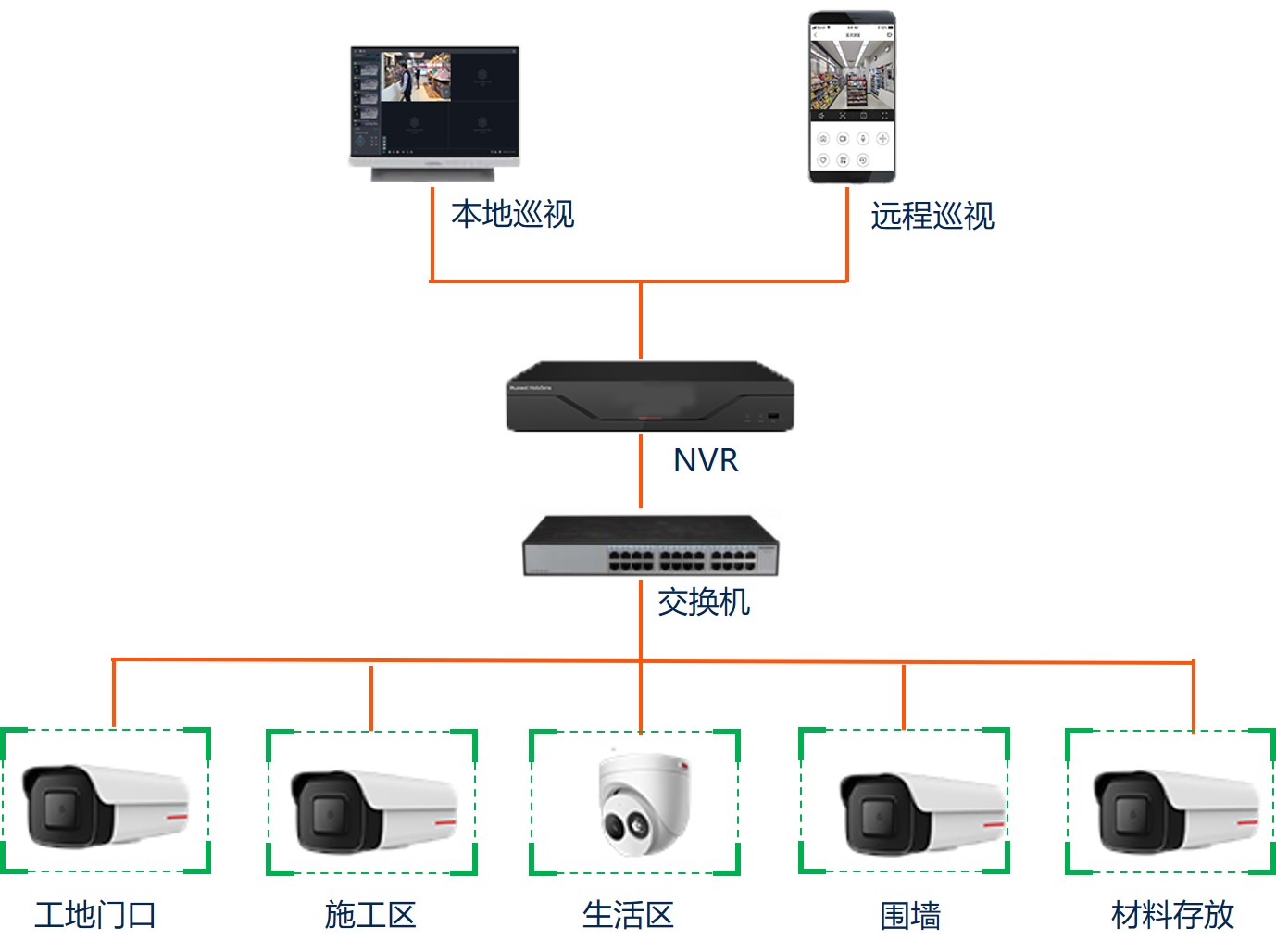 建筑工地智能安防系统主要对工地出入口、围墙、施工区、生活区、材料存放区等进行监控组成