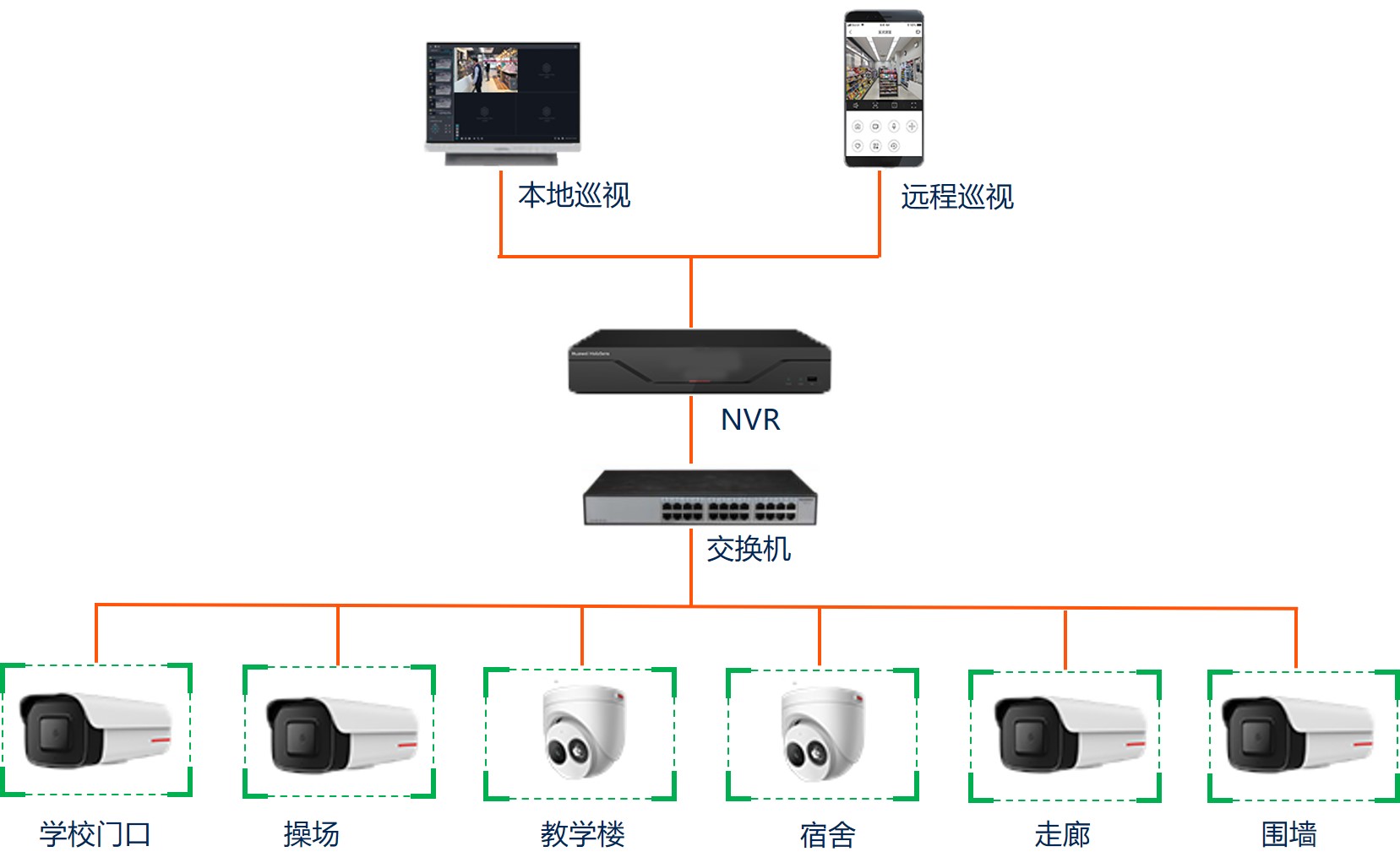 学校智能安防系统主要对学校门口、操场、教学区、宿舍、走廊、围墙等进行监控组成