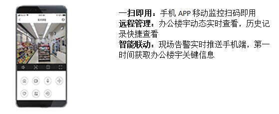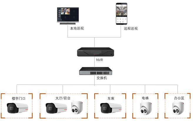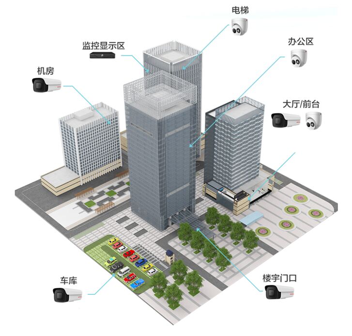 办公楼宇智能安防系统主要对大门出入口、办公区、大厅/前台、电梯、车库、机房等进行监控组成:组网方案