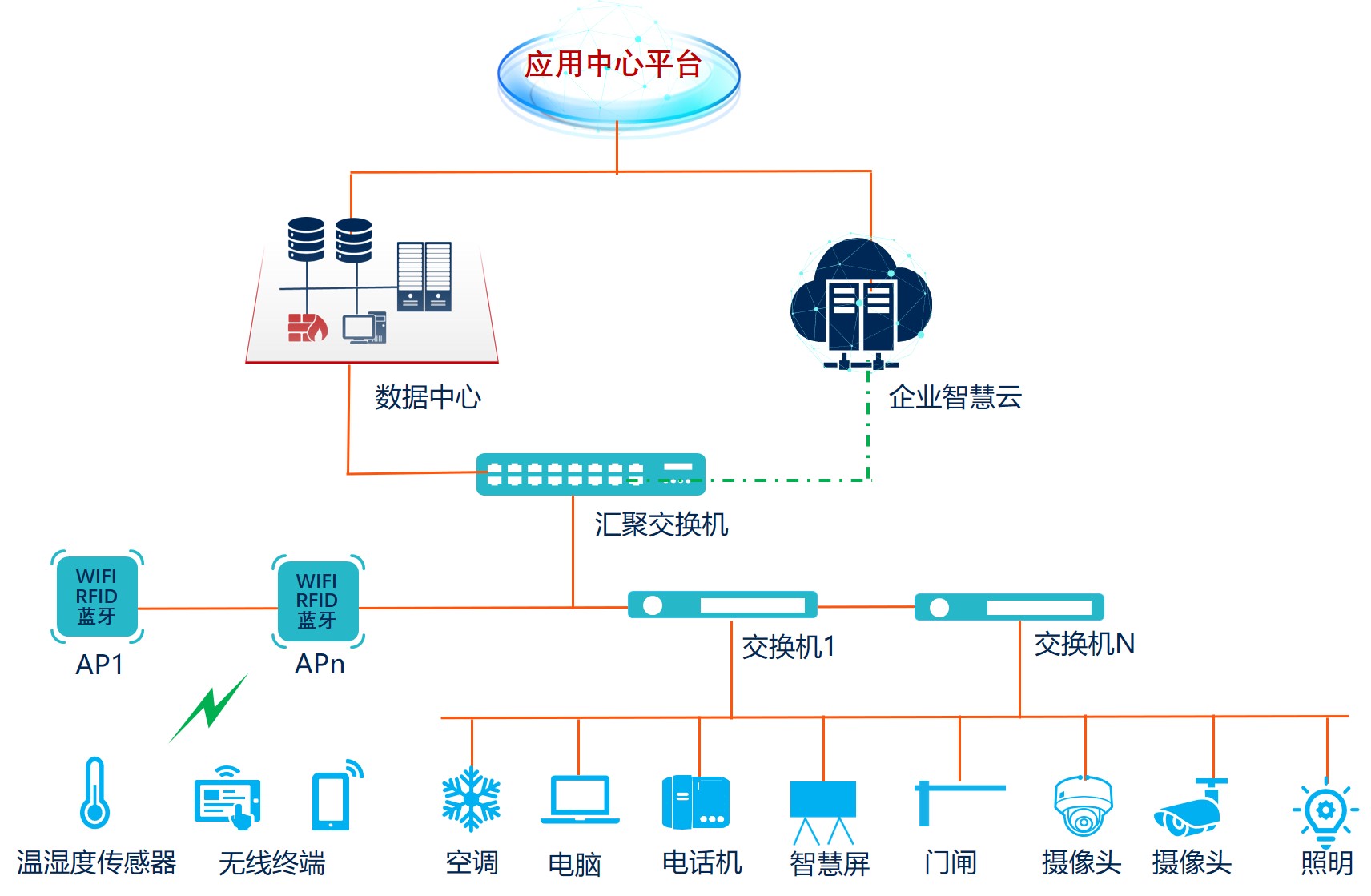 部署IOT+WIFI+有线三网融合的方案作为办公大楼众多不同终端的连接和数据的传输,实现网络无死角全覆盖、全连接;同时,一张IP网统一承载多项业务;