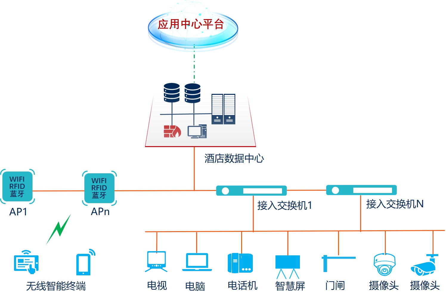 部署有线无线融合通信的方案作为酒店众多不同终端的连接和数据的传输,不仅实现网络无死角全覆盖、全连接,同时一张IP网统一承载语音、视频、数据等多项业务;